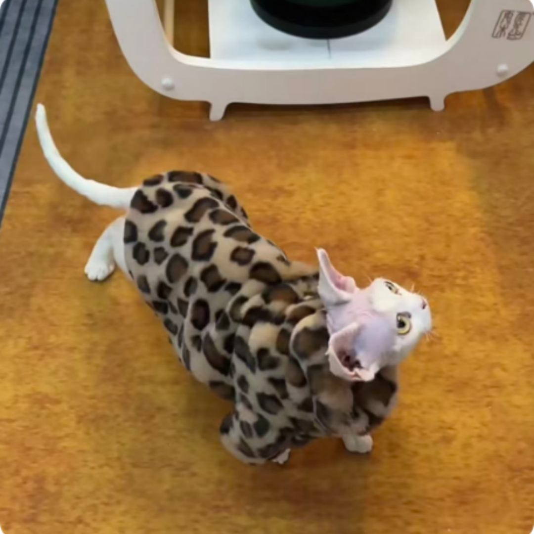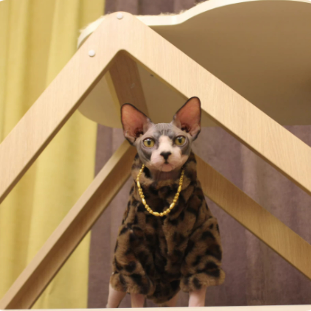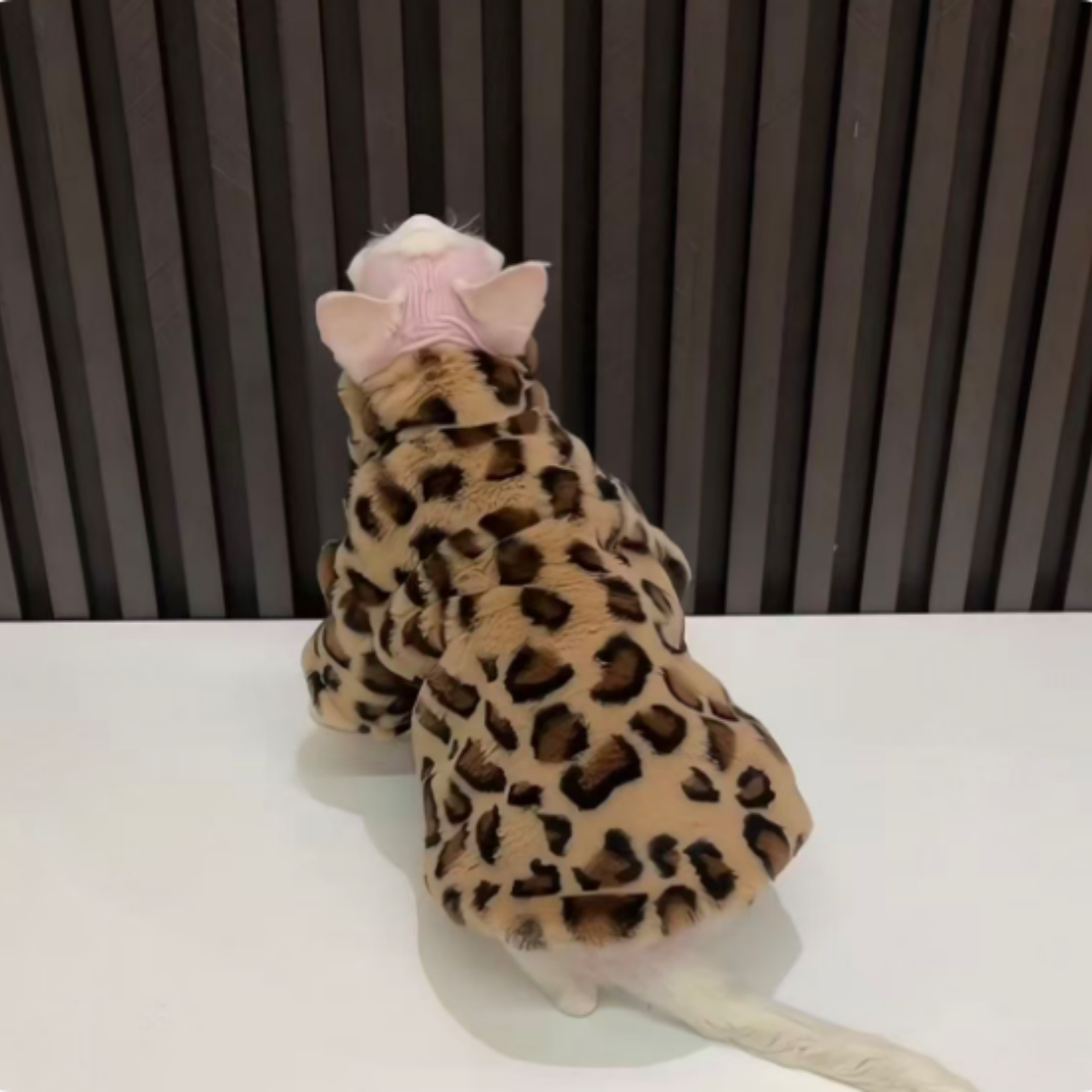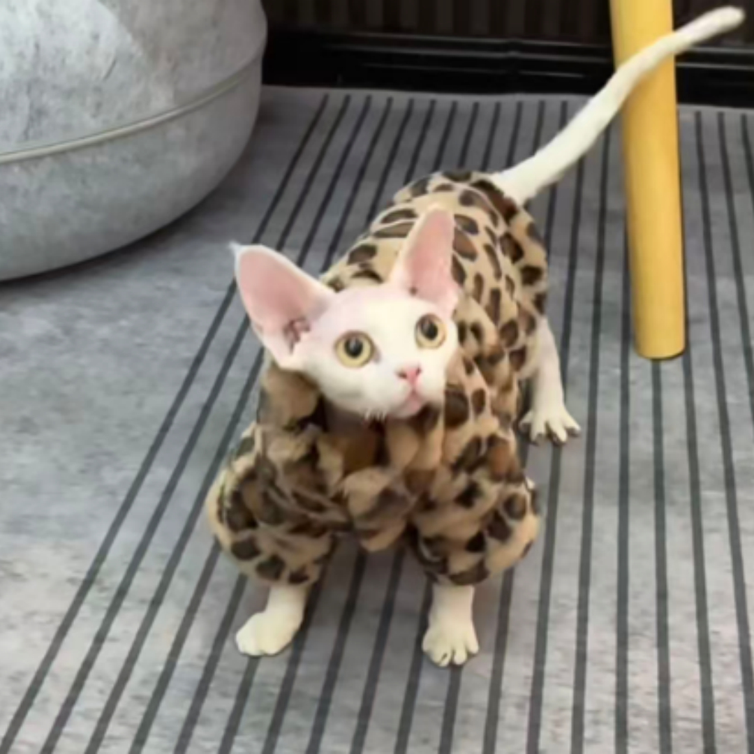 Tu gato sin pelo merece sentirse arropado y protegido como se lo merece. Este precioso abrigo de leopardo ha sido diseñado especialmente pensando en el bienestar de los gatos desnudos, que necesitan ese extra de calor y cuidado que solo un dueño que ama de verdad puede dar.